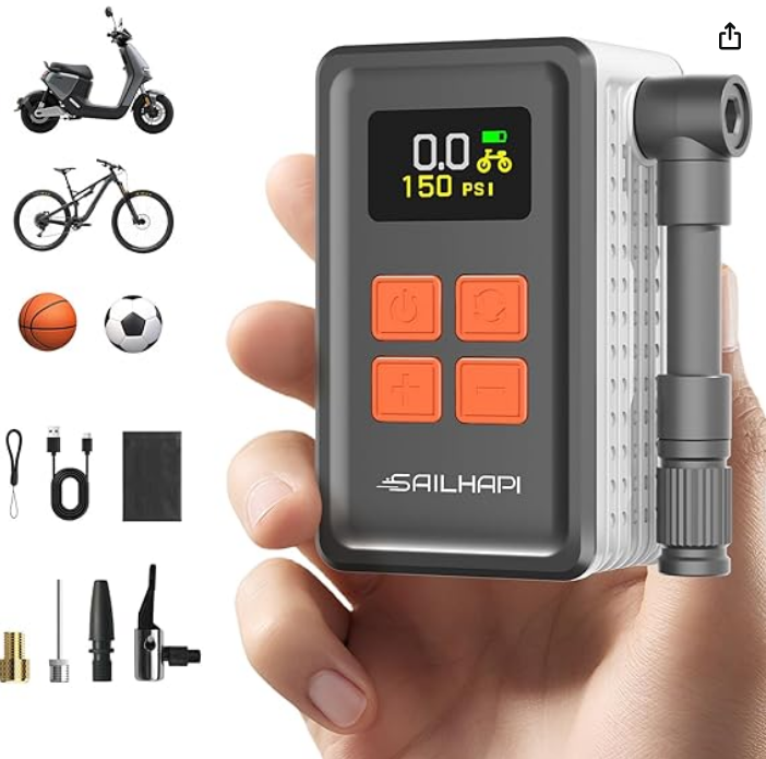 Mini Bike Tire Pump (150PSI Fast Inflation with Guage) (Presta and Schrader Valve) Portable Electric Air Pump for Road and Mountain Bicycle, E-Bike, Motorcycle, Sports Ball